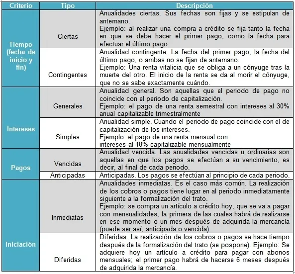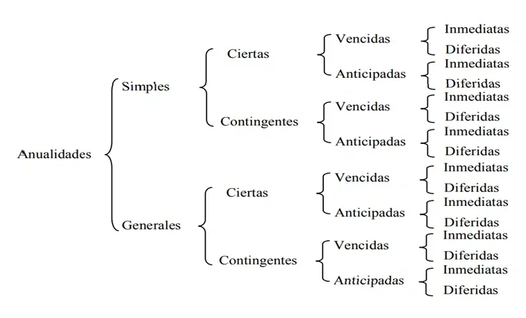 Dado que entre cada tipo de criterio de clasificación (tiempo, intereses, pagos, iniciación) no son mutuamente excluyentes; la diversidad de anualidades puede ser de la siguiente manera: